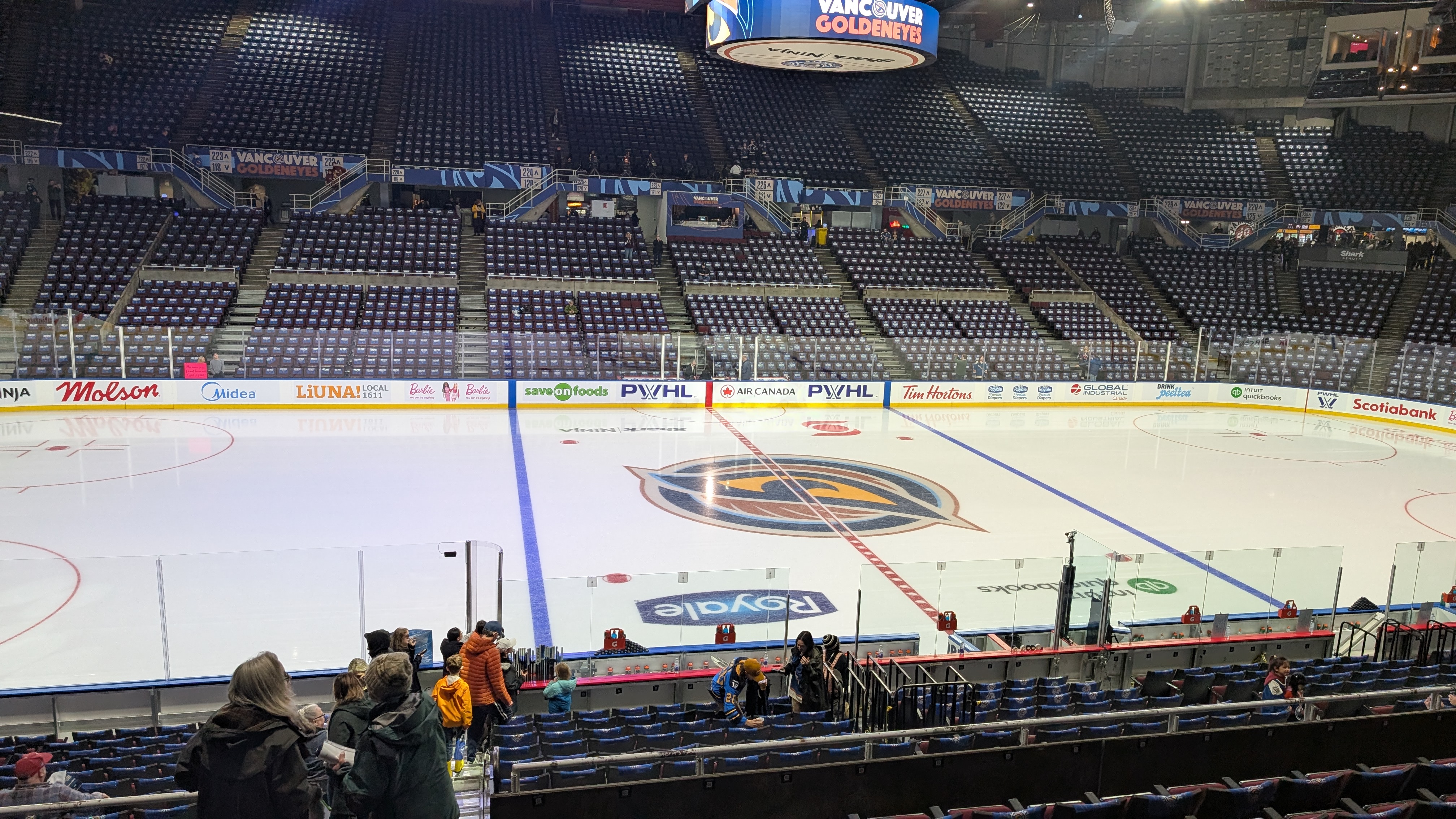 This was my first time inside Pacific Coliseum. As a former Canucks fan (in the pre-Kraken days), I am certainly aware of the history of the building and I was very excited to finally see a game there. A lot has been said about the Goldeneyes being the only PWHL team with their own rink - including the highly entertaining Primary Tenant Pod - and I had heard rave reviews from the Jock’s In Jills crew about the recent transformation of the facility. Even knowing all of that before we arrived, it was still incredible to see a building dedicated to women’s professional hockey. The Goldeneye brand is EVERYWHERE - including, of course, at center ice. Is it a 57 year old building? Yes, yes it is. But is also incredibly well maintained and primed to host PWHL hockey for many more seasons. As someone who was there when Megan Rapinoe and the Reign were playing at Memorial Stadium at Seattle Center - I can tell you, this is certainly not that.