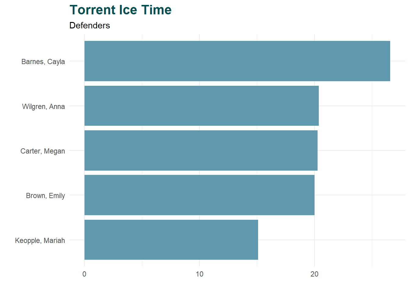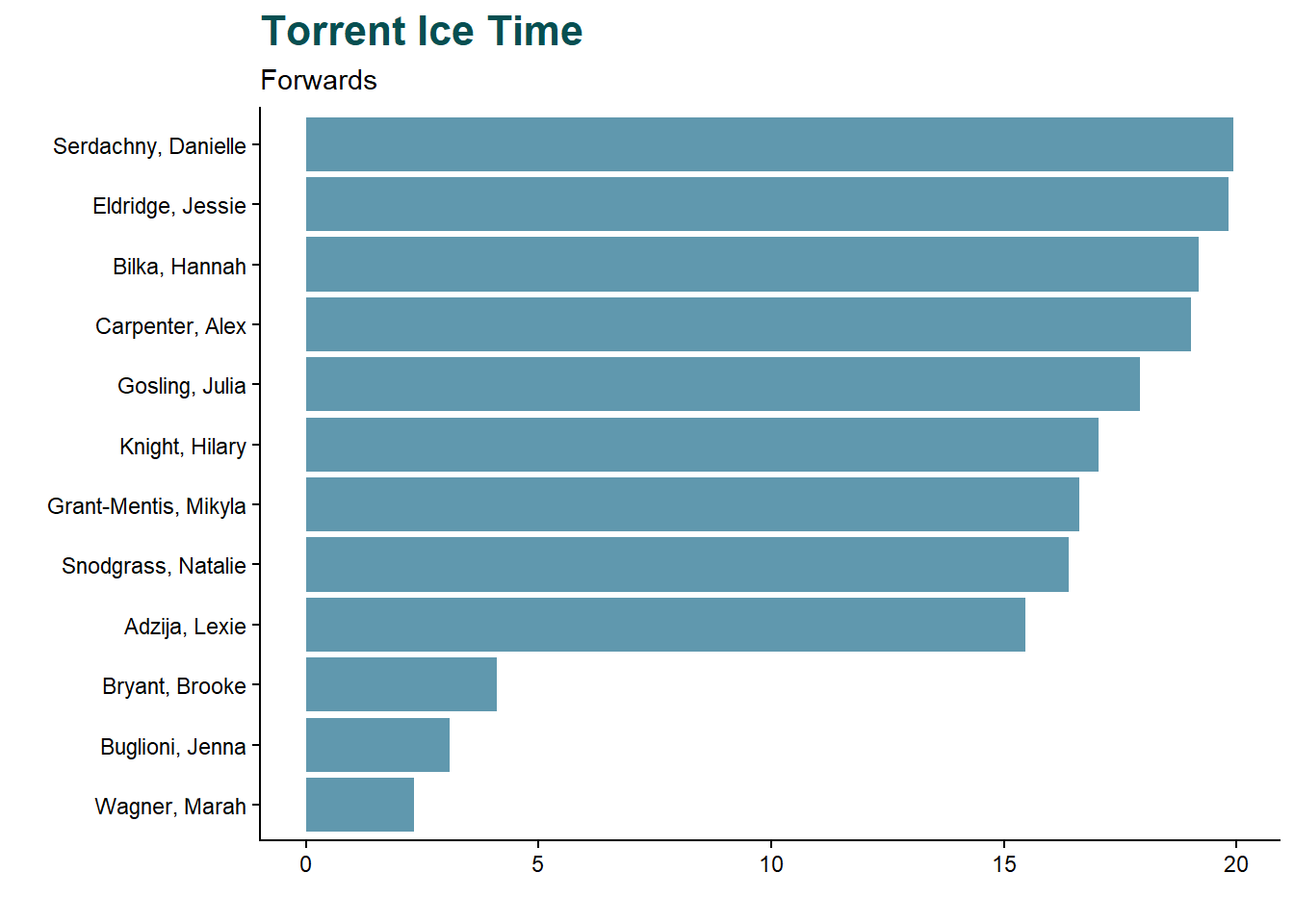# TOI plot sea_box %>%filter(pos %in%c("C", "RW", "LW")) %>%ggplot(aes(x =reorder(name, on_ice_min), y = on_ice_min)) +geom_col(fill ="#6098AE") +coord_flip() +labs(title ="Torrent Ice Time",subtitle ="Forwards",x ="", y ="") +theme_classic() +theme( plot.title =element_text(color ="#074F51", size =16, face ="bold") )