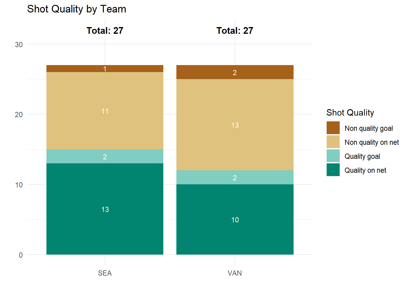 Looking into the data I could coax out of the hockeytech API, I wanted to see how the offenses from these two teams stacked up. I haven’t found a publicly available xG model for the PWHL, but the official game recap does provide individual shot information, including shot quality (either quality or not). This gives us a better sense of how each team attacked during the game.