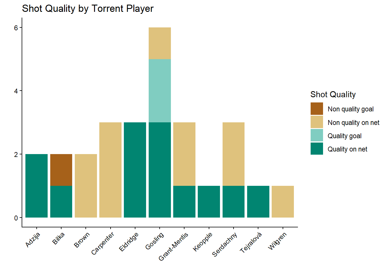 While each team registered 27 shots on goal, the Torrent out paced Vancouver 13-10 in quality shots (excluding goals), while each team got 2 goals on quality shots. The two “non quality” goals against decided the game in the game tying goal from Claire Thompson and Boreen’s winner. Those are tough to give up but they can also be fixed, so not something to worry about right now.