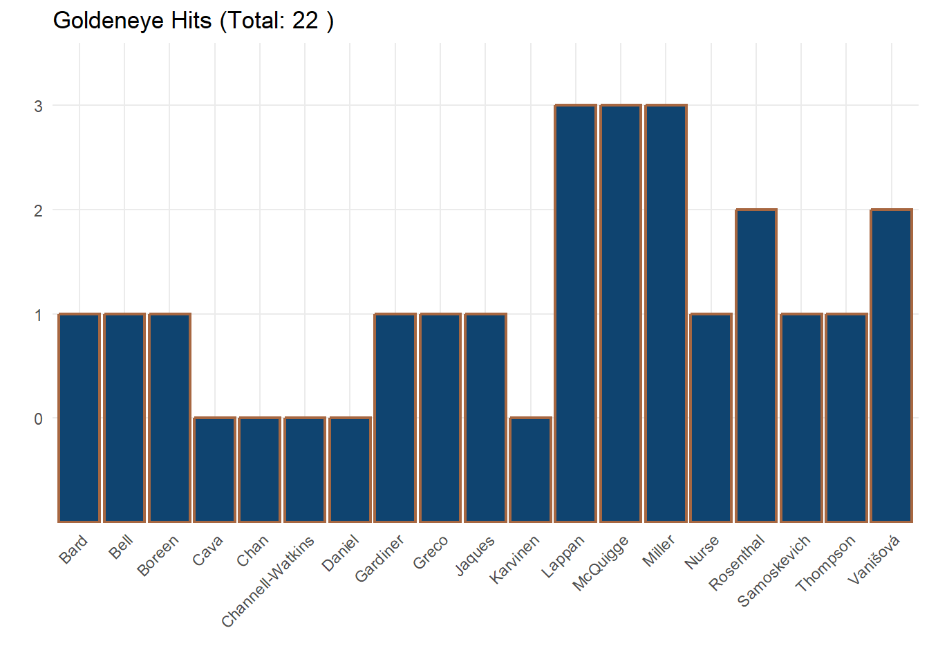 player_shots %>%filter(player.team_code =="VAN") %>%ggplot(aes(x=player.last_name, y = total_shots, fill = shot_quality_description)) +geom_bar(stat ="identity") +scale_fill_brewer(palette ="BrBG")+labs(title ="Shot Quality by Goldeneye Player",x ="",y ="",fill ="Shot Quality") +theme_minimal()+theme(axis.text.x =element_text(angle =45, hjust =1))